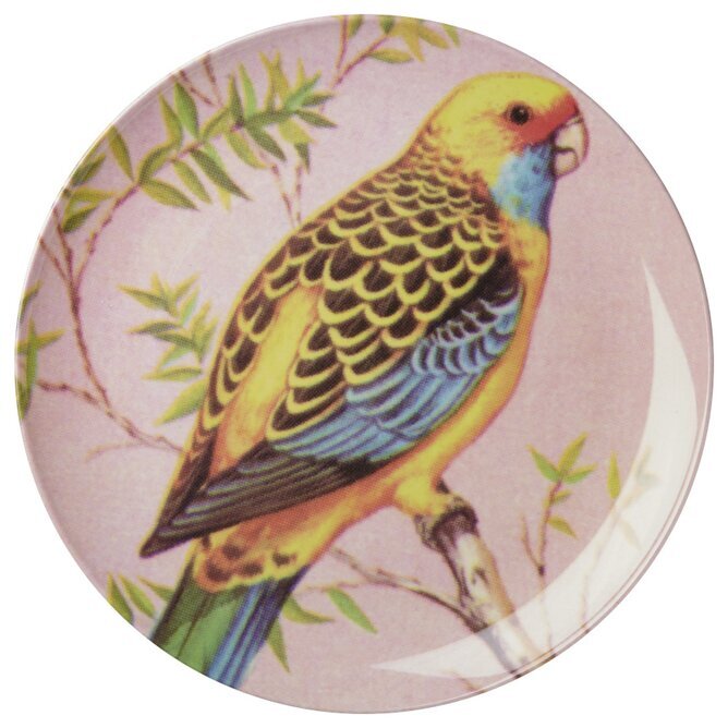 Bakgrunden på tallriken är diskret rosa, vilket skapar en mjuk och lugn bas för fågelns klara färger att framträda mot. Runt omkring fågeln ser vi grenar och bladverk som återger en känsla av natur och friluftsliv. De gröna, detaljrikt avbildade bladen ger ytterligare lager av naturlig skönhet till designen och förstärker känslan av ett naturligt habitat.