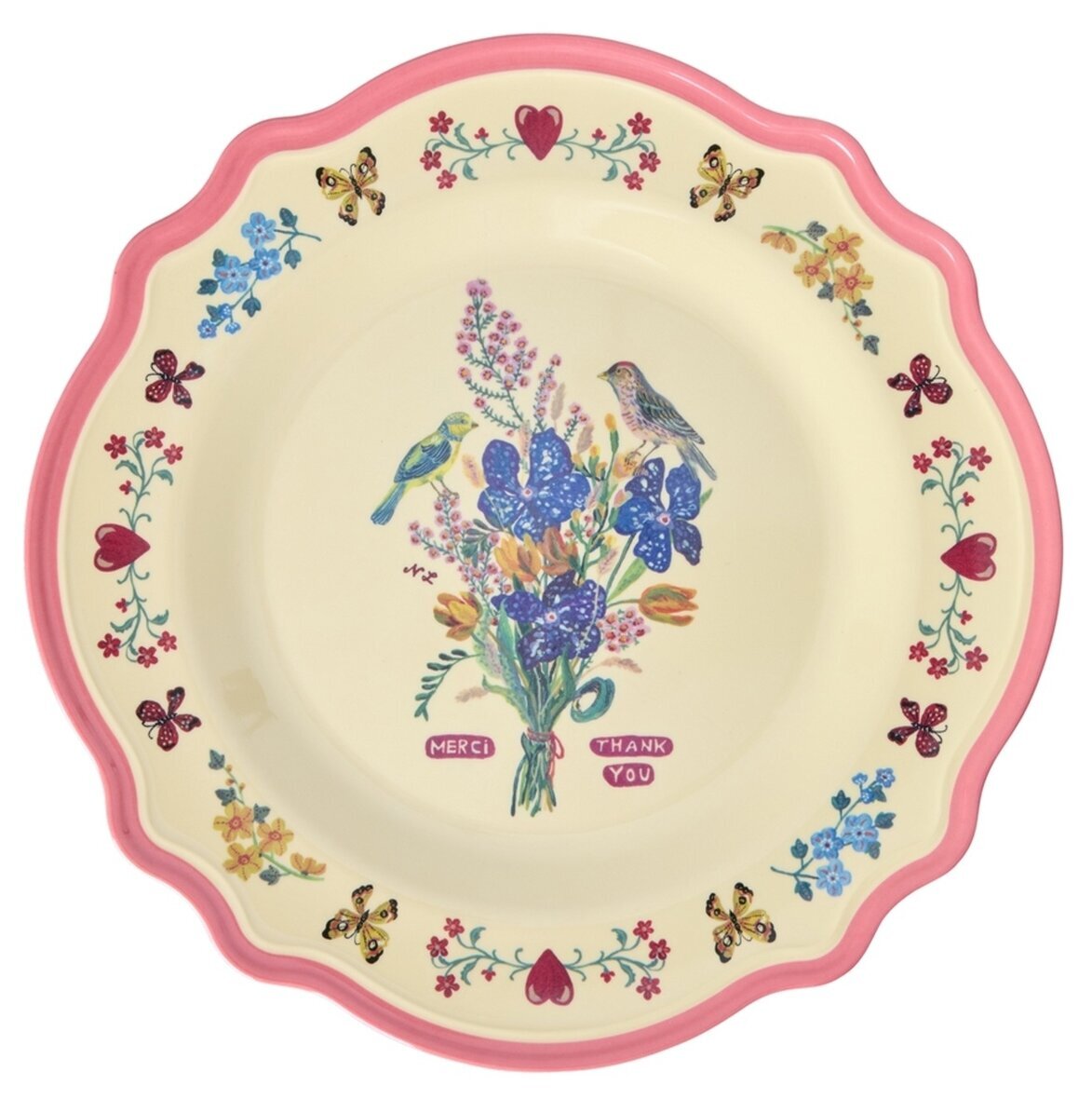 Denna unika tallrik från Rice i samarbete med Nathalie Lété kombinerar lekfull konst med praktisk funktion. Med vackra blommor, fåglar & fjärilar, blir den en riktig favorit på bordet.