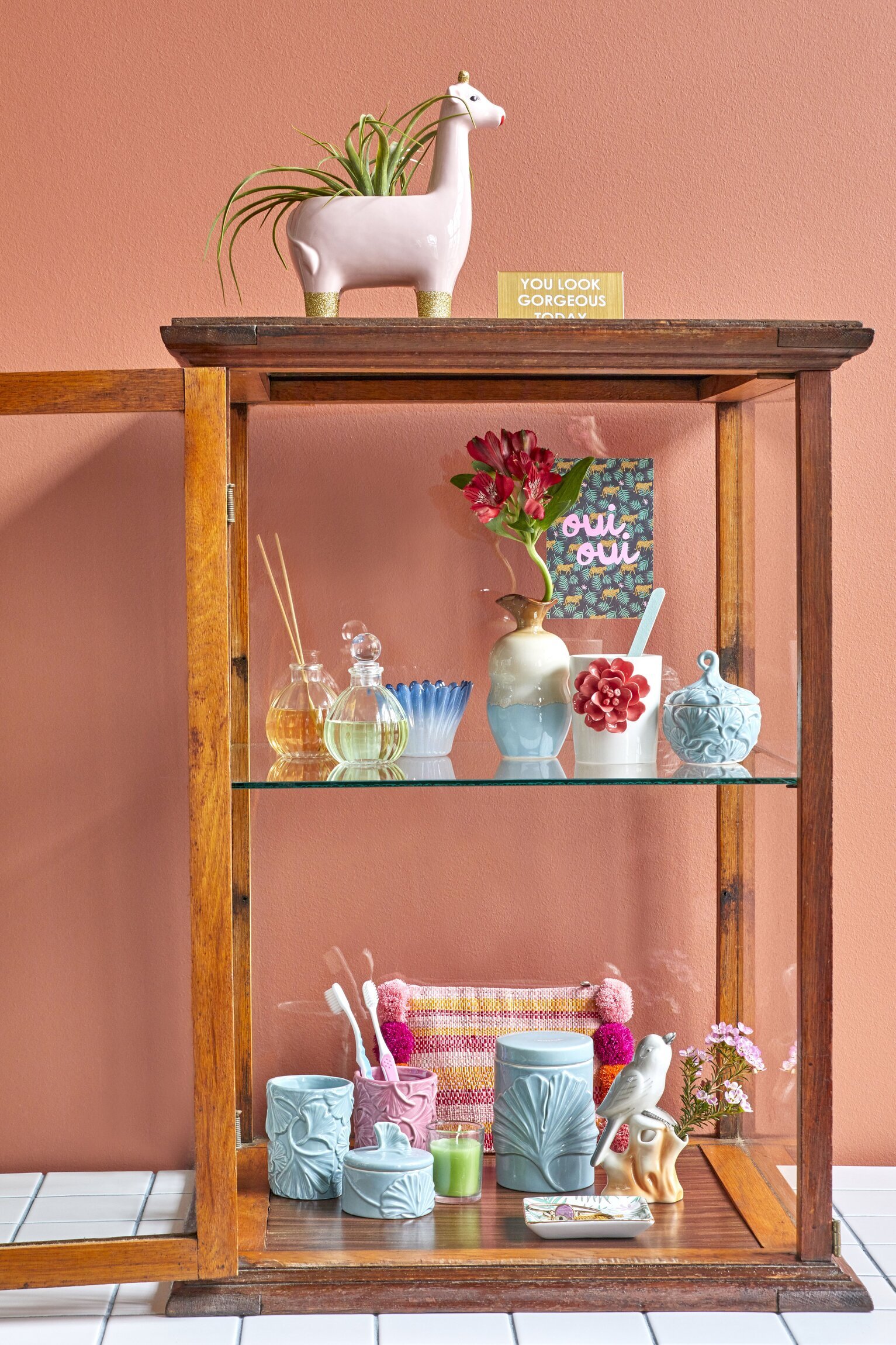 Bredvid tandborstmuggen står ett doftljus i en liten transparent behållare, vars gröna vax är både lugnande och harmonierande med de övriga nyanserna. Ett sidobord pryds av en stiliserad fågelskulptur som sitter på en gren, vilket ytterligare förhöjer det naturvänliga temat. En mindre, rektangulär bricka agerar som samlingsplats för smycken eller små föremål, dess färgglada mönster fångar blicken.