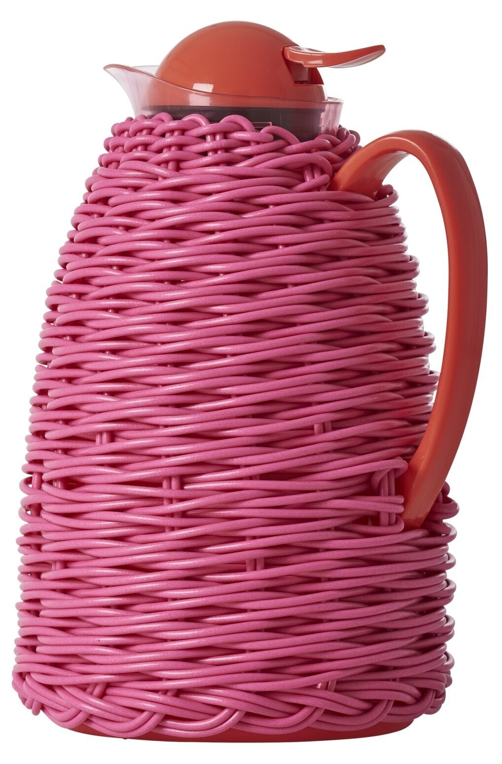 Termosen heter Cerise och visar en unik yta som ser ut att vara flätad, vilket ger den en intressant strukturell detalj. Detta flätade mönster består av ceriserosa remsor som slingrar sig runt termosen, vilket gör den både funktionell och dekorativ. Den robusta kroppen ger ett solitt intryck, vilket gör att den kan stå emot både tidens tand och naturens krafter.