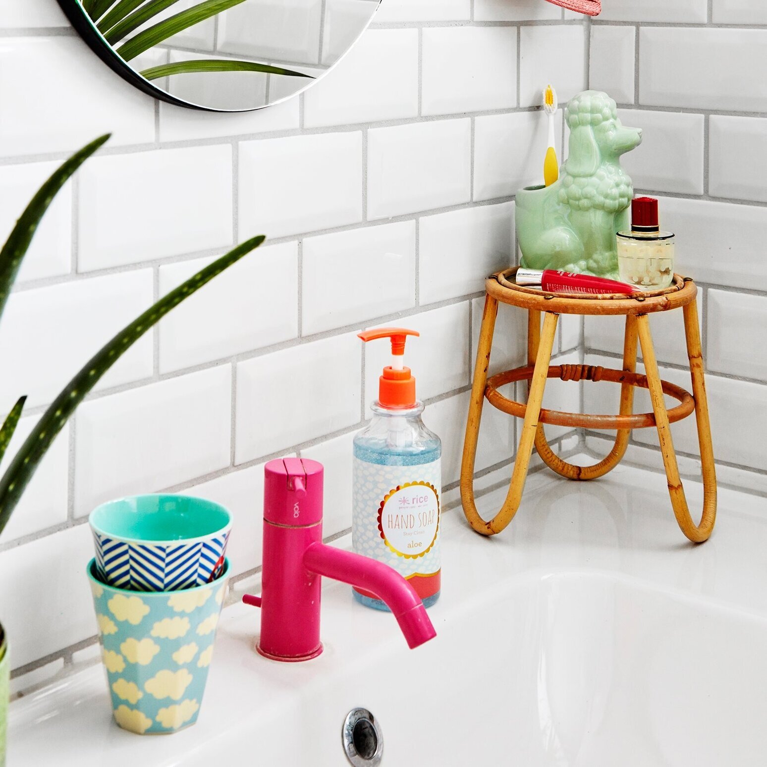 Längre fram, till vänster om handtvålen, står två staplade koppar i fräscha toner. Den övre koppen har ett geometriskt mönster i blått och vitt, medan den undre koppen är dekorerad med ljusa moln mot en himmelsblå bakgrund. Dessa färgklickar ger badrummet en lekfull och livfull karaktär.