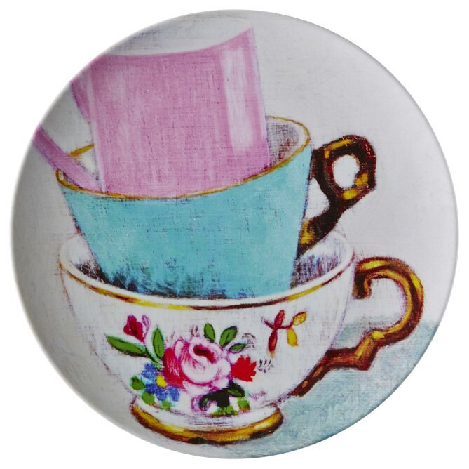 Assiett med motiv av av tre tekoppar. Assietterna finns i flera färger och mönster som är fina att kombinera tillsammans. Denna assiett passar till både kalaset, festen, picnicen och framförallt hemma till barnen. Håller i alla lägen, inget glasskross efter en tappad tallrik. Tål maskindisk men inte micro. Denna produkt är godkänd för livsmedel.