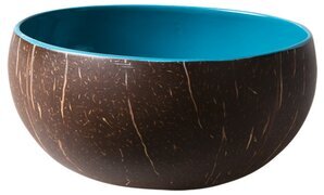 Skålen har en yttre yta som liknar en naturlig kokosnöt. Denna naturliga yta har små, ljusare strimmor som löper längs med dess yta, vilket ger en känsla av organiskt ursprung. Trots dess rustika yttre är ytans finish noggrant lackerad för att ge en jämn och resistent yta som skyddar mot fukt och slitage.
