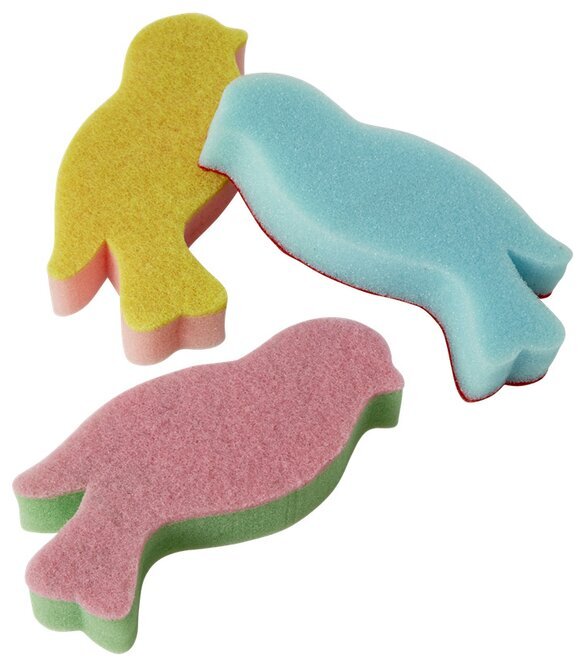 Bilden visar tre disksvampar från Köpstaden.se, formade som fåglar, en unikt kreativ detalj från varumärket Rice. Var och en av svamparna har en distinkt färg som skiljer dem åt och fångar ögat på ett lekfullt sätt.