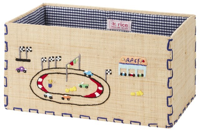 Korgen är formad som en rektangel med en robust och stadig konstruktion som gör den både funktionell och hållbar. Den yttre delen av korgen är prydd med ett handbroderat motiv som illustrerar en bilbana. Det detaljerade mönstret föreställer en oval racerbana med små leksaksbilar i olika färger som blått, grönt och lila. Små checkered flaggor är strategiskt placerade kring banan, vilket förstärker racingtemat.