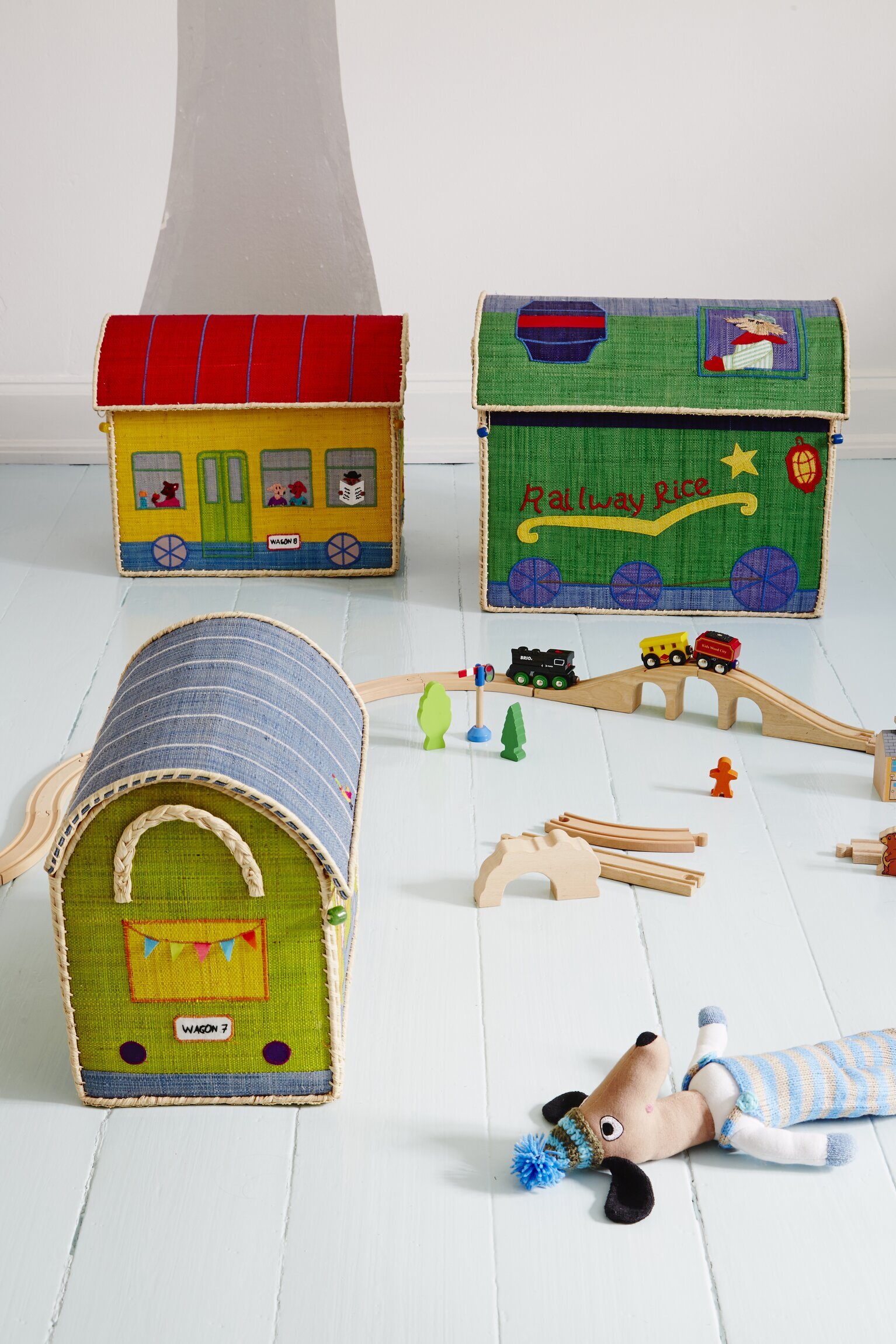 Charmiga förvaringslådor formade som lekfulla lok samt tågvagnar från danska Rice. Huslådan som är handgjord av färgglad bast är både praktisk och samtidigt underbart söt till leksaker. Taket är öppningsbart och fästes fast med små hakar. Korgarna har flätade handtag på sidorna och lekfullt broderade detaljer.