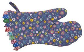 Den främsta färgen på grytvanten är en livfull lila nyans, täckt med ett mönster av olika små blommor i gula, rosa, och vita toner, vilket ger ett lekfullt utseende. Blomdesignen sprider sig över hela vanten och skapar en känsla av rörelse och livlighet. Konstruktionen är sydd i ett rutmönster som ger ett quiltat utseende, vilket inte bara förstärker dess slitstyrka utan också bidrar till en estetiskt tilltalande yta.