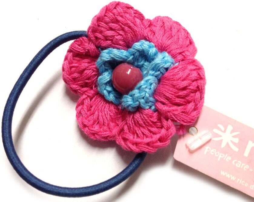 På bilden ser vi denna hårsnodd prydd med en blomformad design. Blomman har kraftiga och distinkta färger, vilket ger den en livfull framtoning. De yttre kronbladen är i en stark cerise ton, som ger blomman en rik och iögonfallande utsida. De är virkat i ett garn som ger en mjuk, tjock textur med lätt framträdande reliefstickning som ökar dimensionen i utseendet. I blommans mitt finns en inre cirkel av turkosa kronblad, som i sin tur skapar en kontrasterande effekt mot de yttre cerise bladen.