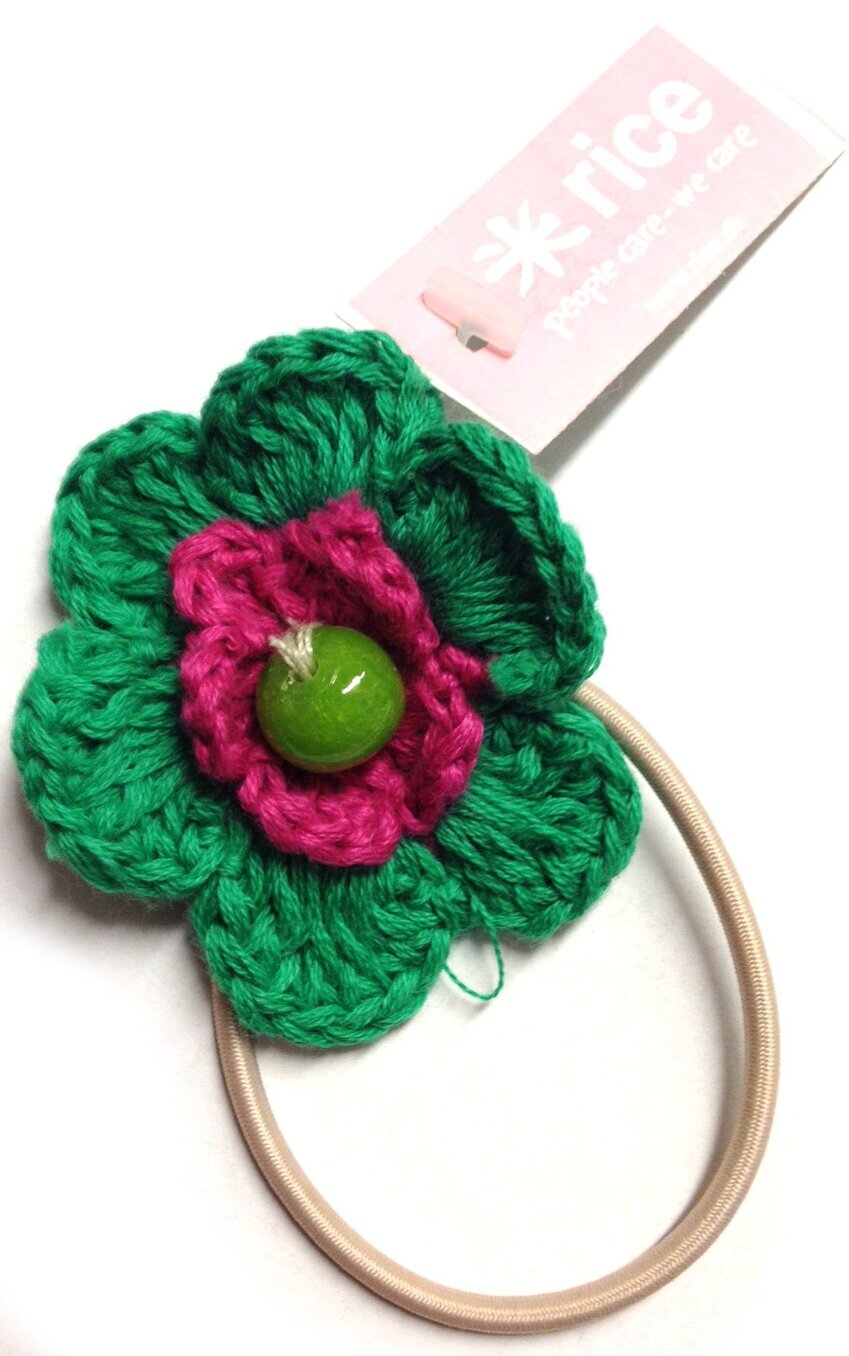 Bilden visar en hårsnodd från varumärket Rice, som finns tillgänglig hos Köpstaden.se. Denna produkt, benämnd som Hårsnodd Blomma Grön/Fushia/Grön, kännetecknas av sin unika och färgglada design som kombinerar både estetik och funktionalitet.