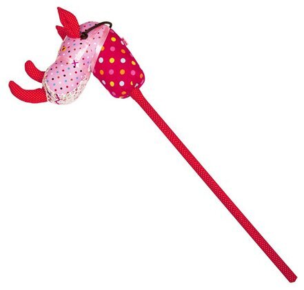 Färgstarka käpphästar i blommigt och prickigt mönster. Käpphästen har utseendet av en flodhäst och är i tyg. Mått: 85 cm x 31 cm. Läs mer