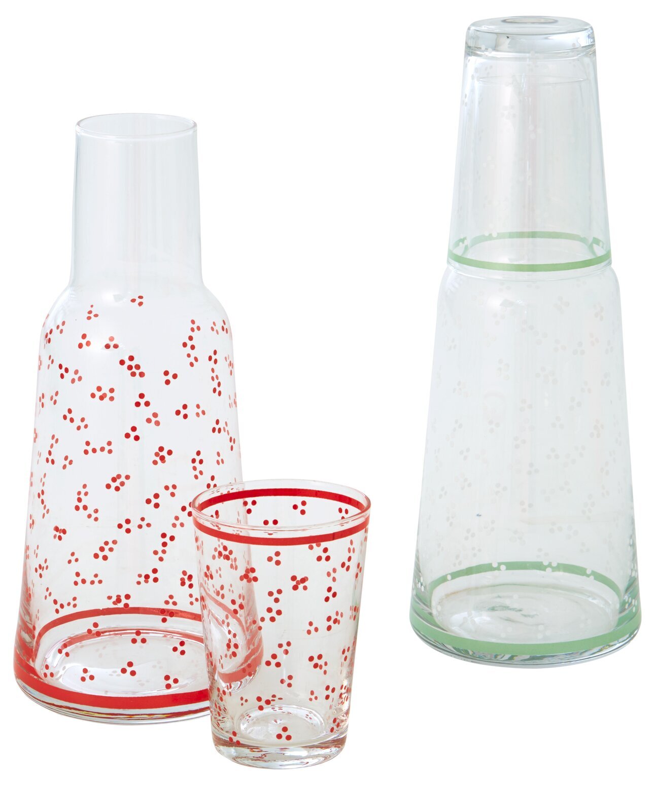 Mått karaff: Höjd 23 cm. Diameter 10 cm. Mått glas: Höjd 10 cm. Diameter 7 cm.