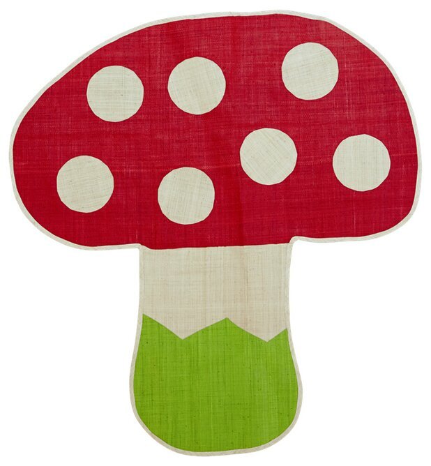 Bilden visar en färgglad och fantasifull matta från Köpstaden.se, en butik känd för sitt breda sortiment av unika och funktionella produkter för hemmet. Denna specifika matta, kallad Matta Raffia Svamp S och skapad av varumärket Rice, har ett lekfullt svampmotiv som omedelbart fångar blicken.