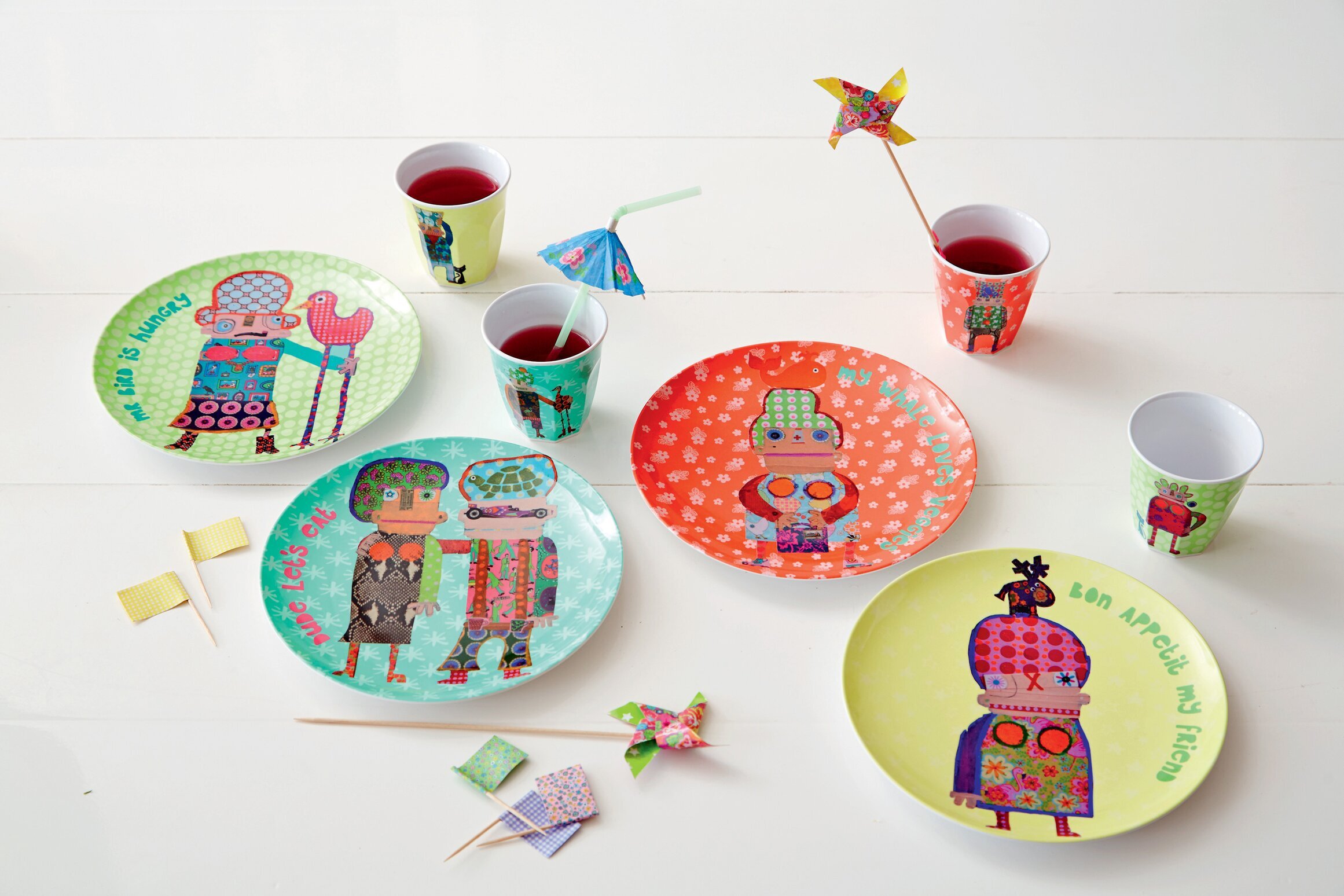 Förutom dessa melamintallrikar finner vi även flera färgmatchande muggar på bilden, fyllda med en röd dryck som ytterligare kompletterar färgtemat. Muggarna är också dekorerade med olika figurer, vilka speglar den konstnärliga stil som kännetecknar Rice.