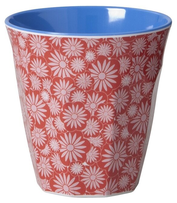 Muggen har en klassisk cylindrisk form med lätt uttalad bas och mjukt rundade kanter som gör den bekväm att hålla. Det röda blommönstret sträcker sig från botten hela vägen upp till kanten, vilket förstärker dess kontinuerliga och sammanhängande utseende. Insidan av muggen, däremot, kontrasterar med sin klara blå färg som adderar en extra dimension och överraskning för användaren. Denna inre färgpalett kompletterar det yttre blommönstret på ett harmoniskt sätt.