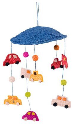 Materialet i mobilens element framhäver en handgjord, raffiamässig stil som bidrar till ett naturligt och trivsamt intryck. Raffia är känt för sin hållbarhet och den naturliga skönheten i detta material harmoniserar väl med den livliga färgpaletten hos mobilens dekorationer.
