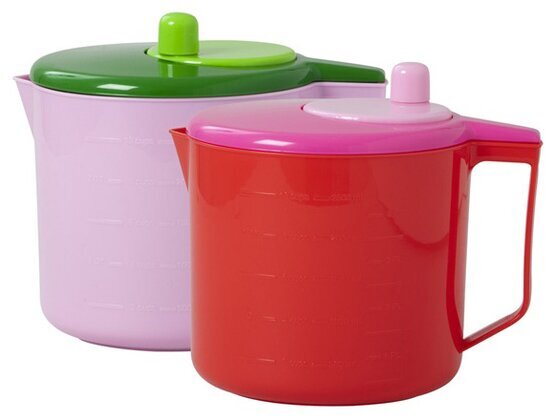 Bakom den röda slungan ser vi en andra modell i en mjuk lavendelfärg. Denna slunga har ett grönt lock med en matchande grön knob, som skapar en fräsch kontrast mot den ljusa basen. Den grön-toppade slungan har inga synliga handtag från denna vinkel, vilket gör att dess cylinderform framträder tydligt. Båda dessa köksredskap är utformade med skarpa linjer och rena, rundade kanter vilket underlättar rengöring och hantering.