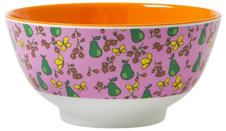 Skålen präglas av ett unikt och iögonfallande mönster. Utsidan är överdragen med en livlig lila bakgrund. På denna bakgrund finns utspridda motiv av gröna päron som ser handritade ut, vilket ger en lekfull känsla. Päronen balanseras av gula fjärilar och små blommor i olika nyanser av rosa och rött som kompletterar den livfulla bakgrunden.