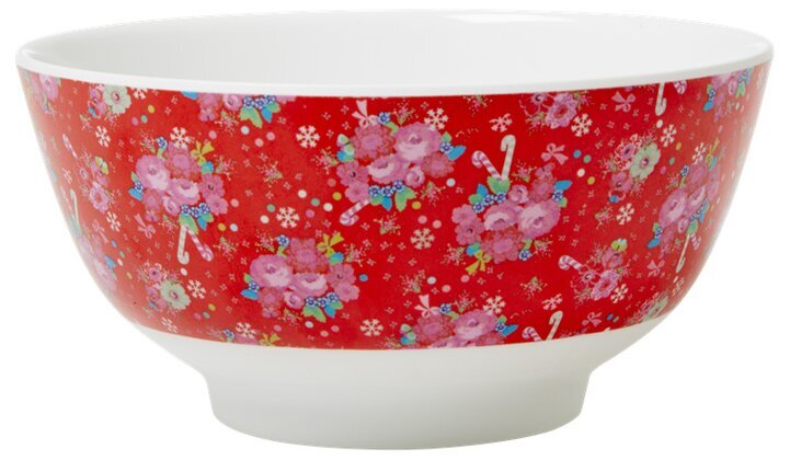 Djup skål i slitstark melamin med ett fint mönster av blomster, snöflingor & polkagrisar. Användbart både i hemmet och på picknicken. Kan användas till flingor, desserter, snacks, dipp mm. Kan diskas i diskmaskin men inte användas i micro.