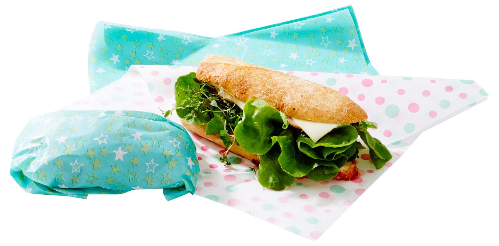 Den centrala detaljen på bilden är dock det omsorgsfullt designade smörgåspapperet. Det finns i två olika mönster — ena delen av papperet är täckt av ljusgröna och vita stjärnor mot en turkos bakgrund, vilket ger en lekfull och festlig känsla. Den andra delen har ett prickigt mönster i mjuka toner av rosa och grönt. Dessa mönster, kombinerade med den mjuka pappersstrukturen, bidrar till att göra inpackningen inte bara praktisk utan även estetiskt tilltalande.