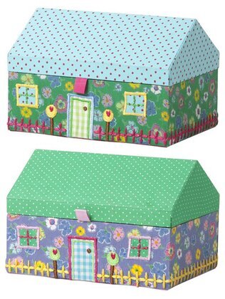 Detta smyckeskrin har 2 st band som håller upp skrinet när det är öppet. I skrinet finns det en avtagbar övre del där man kan förvara ringar & örhängen. I den undre delen kan man förvara sina halsband. Ett smyckeskrin som är klätt med tyg & dekorerat som ett litet hus med blommor & staket.