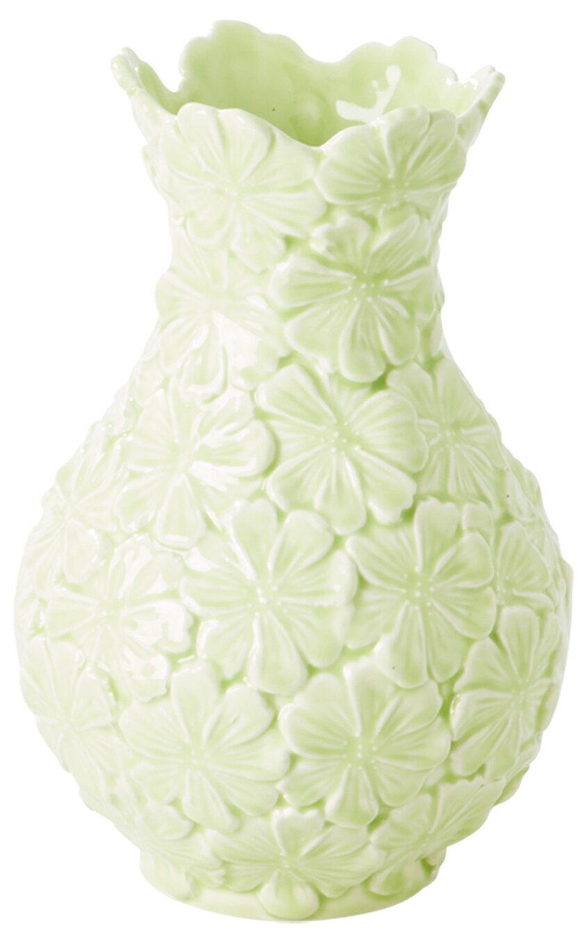 En alldeles underbar vas med präglat blommönster i härlig pastellgrön färg. Vasen är rejäl och stadig och är inte bara fin till att använda som blomvas utan passar även som förvaring samt som en inredningsdetalj. Mått: 28 x 20 cm.