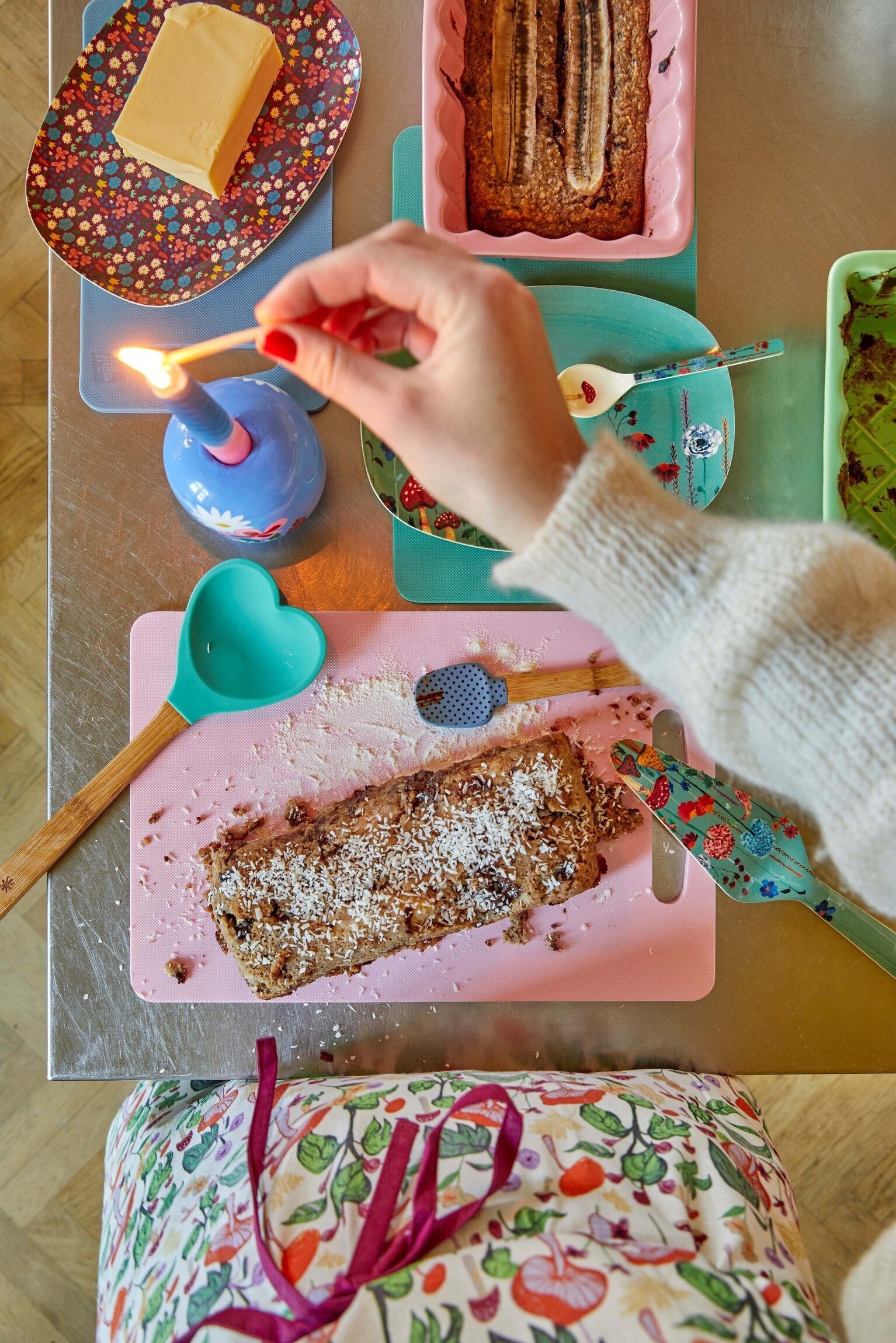 En liten ljusblå hjärtformad sked ligger på skärbrädan och tillsätter en romantisk touch. Skedens placering och den noggrant valda färgen harmonierar snyggt med helheten. Det syns även en närbild på en hand som sträcker sig över bordet för att tända ett blått, konformat ljus i en ljusstake. Fingrarnas djupröda nagellack står ut mot de andra pastellfärgerna och adderar en personlig och varm känsla.