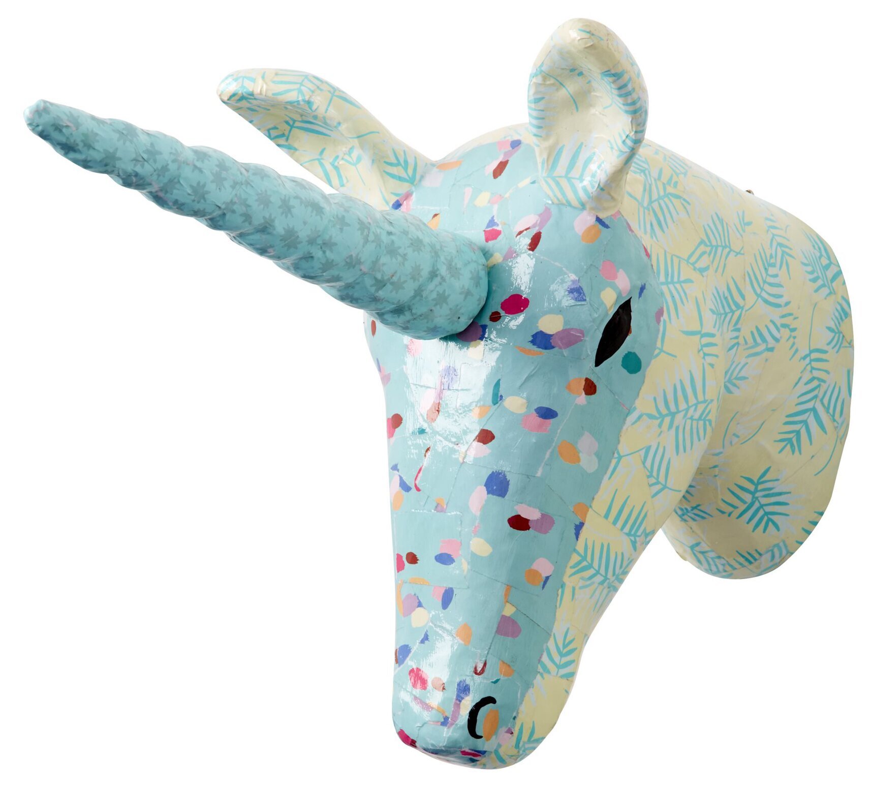 Bilden visar en färgglad enhörning, tillverkad av papier mache och känd under namnet Enhörning Papier Mache. Produkten, som är en del av det breda sortiment som erbjuds av mångsidiga Köpstaden.se, är en skapelse av varumärket Rice. Enhörningens huvud pryds av en rik palett med olika färger och mönster. Basen är i en ljus turkos nyans som täcker större delen av huvudet och det spiralformade hornet, vilket ger en mjuk och lekfull känsla.