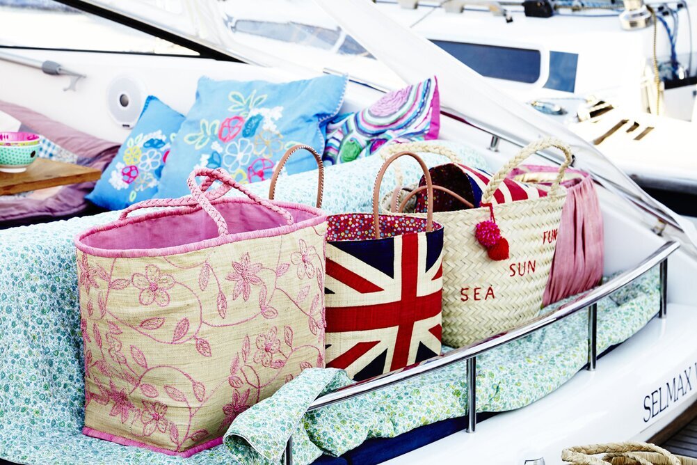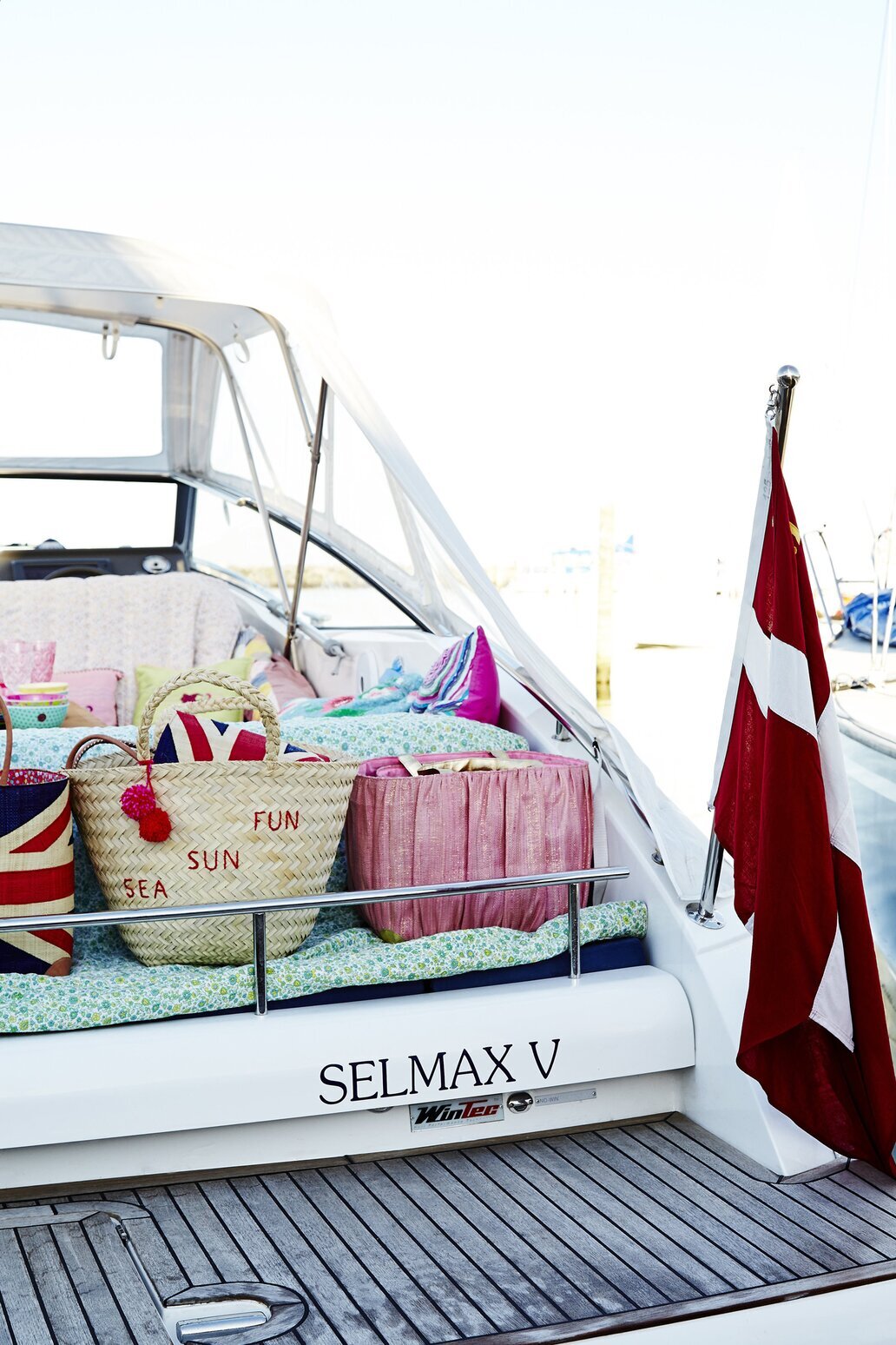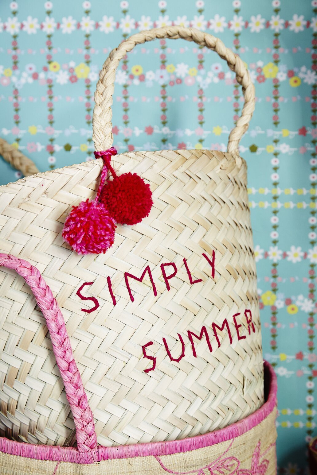 Snygg korg/strandväska från Rice vår/sommarkollektion 2016 - Go For The Fun - På varje väska hänger fina pompoms i garn i liknande färger av texten som är virkad på väskan. Använd den som strandväska, shoppingväska eller som korg till vackra växtligheter. Mått: 21 x 18 x 35 cm, Ø 44 cm.