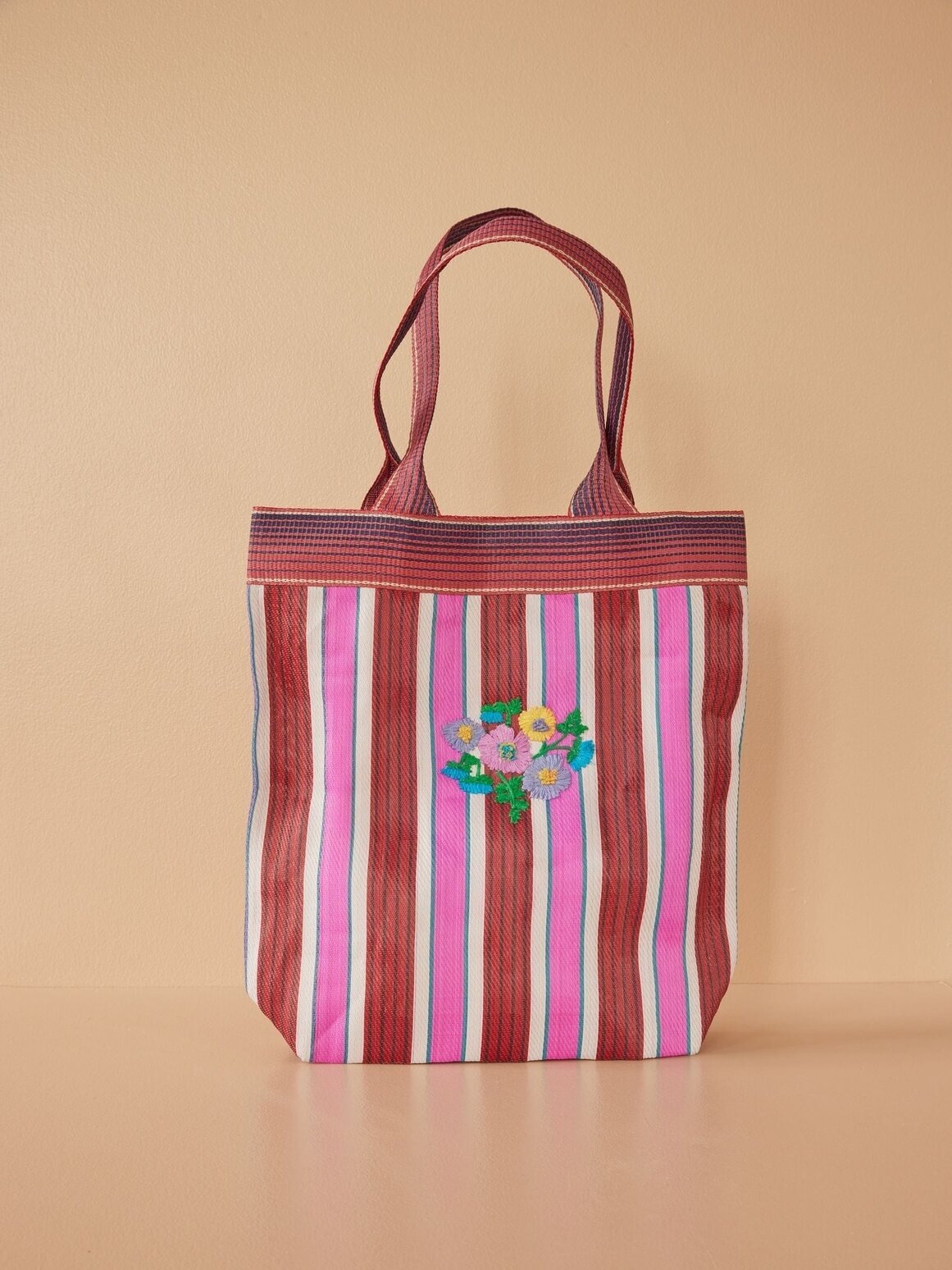 Färgglad shoppingväska med broderade blommor, tillverkad av återvunnen plast. Från Rice.