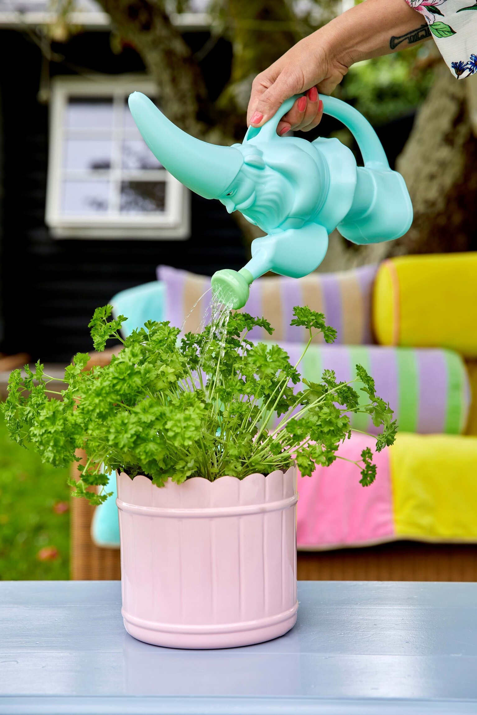 Den handhållna kannan visas i bilden medan den används, med vatten strömmande ner över de friska gröna bladen på en krukväxt. Krukan är en ljusrosa behållare, som kompletterar den pastellfärgade vattenkannan perfekt och förbinder den visuella harmonin i utomhusmiljön. Krukans form är enkel, med en subtil ribbad textur som tillför en diskret estetik till arrangemanget.