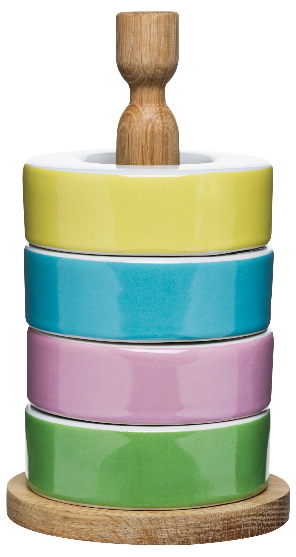 Snyggt & funktionellt set med 4 stycken äggkoppar i härliga pastellfärger som är staplade på ett stativ tillverkat av bambu.