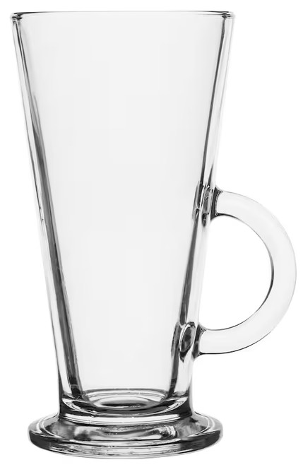 Ytan på glaset är jämn och blank, vilket inte bara gör det estetiskt tilltalande utan också lätt att rengöra. Klart och transparent, materialet fångar ljus på ett sätt som kan skapa reflektioner och ljusspel, vilket ger en extra dimension till dess utseende. Glaset är av en storlek som gör det idealiskt för en mängd drycker, från varma kaffedrycker till kalla, uppfriskande cocktails.