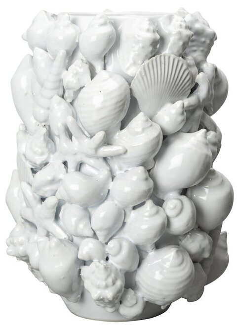 Vacker vas i stengods, dekorerad med krispigt vita snäckor. En vas som är fin både ensamstående som med blomster.