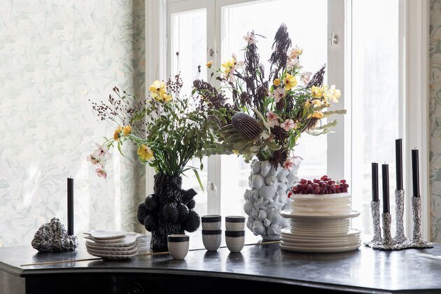 Vacker vas i stengods, dekorerad med krispigt vita snäckor. En vas som är fin både ensamstående som med blomster. Läs mer