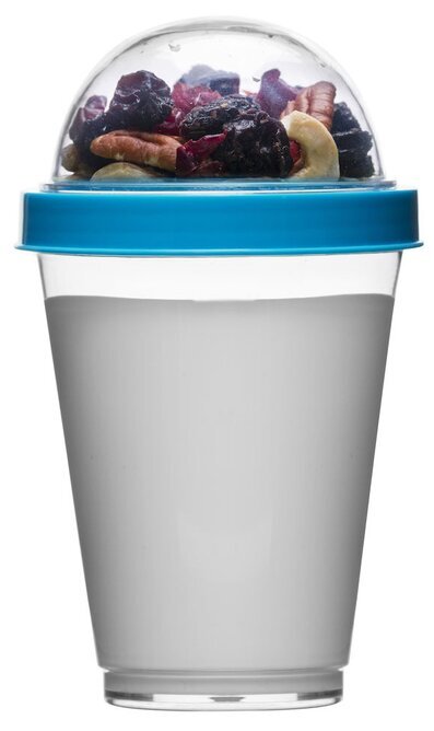 Den övre delen av bägaren, där torra ingredienser som nötter, torkad frukt och bär kan förvaras, är omsluten av ett knallblått lock. Locket knäpps på plats och bildar en säker barriär mellan komponenterna. Det ger användaren en enkel lösning för att undvika att torra ingredienser blir soggiga i kontakt med yoghurten. Det genomgående temat i designen är funktionalitet och tydlighet vilket gör produkten till en perfekt följeslagare för människor i farten.
