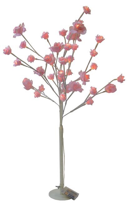 På trädet blommar flera rosa rosor, noggrant placerade längs grenarna. Varje ros har en mjuk, ljusrosa nyans som skiftar något beroende på belysningen, vilket tillför en mjuk och dämpad glöd. Rosorna är konstgjorda men skapade för att ge ett verklighetstrogna intryck, med kronbladens textur och form noggrant utformade. Inuti varje blomma sitter små LED-lampor som lyser upp de delikata kronbladen, vilket förstärker det estetiska värdet av produkten.
