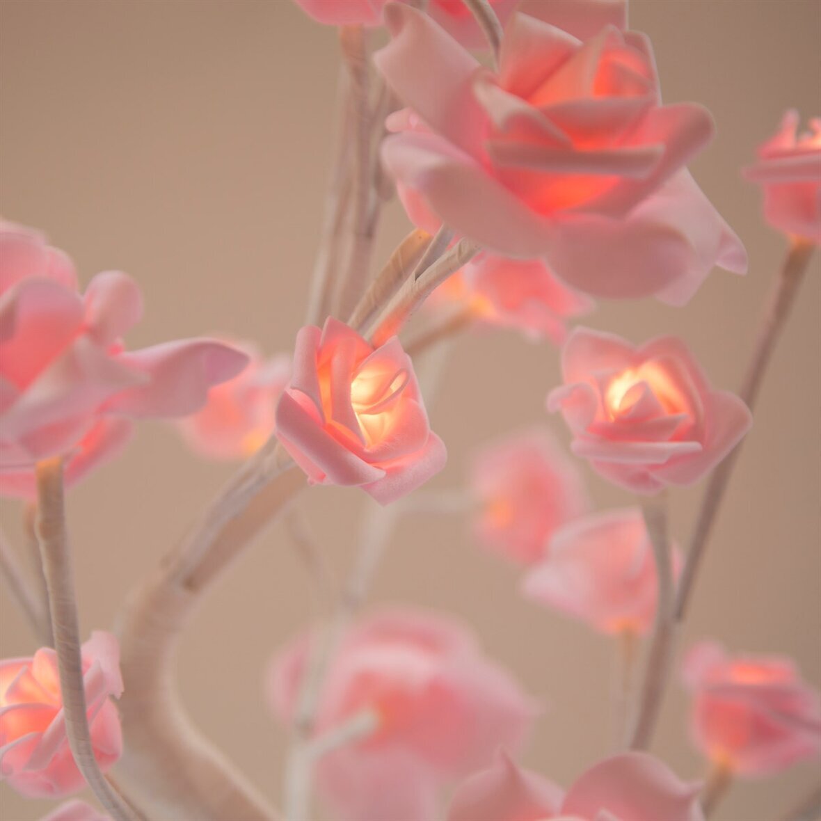 Dekorationsträd med vackra rosa rosor. Trädets rosor har LED-belysning som lyser upp vackert och stämningsfullt. Passar fint som dekorationsbelysning både inne som utomhus (kan ej stå ute i regn) & även en vacker detalj till bröllop och fest.Kräver 3 stycken AA-batterier, medföljer ej. Mått: 90 x 23 cm.