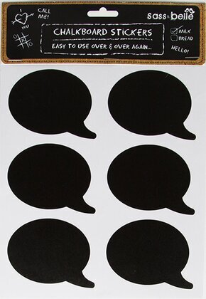 Bilden visar ett ark med sex svarta pratbubblor avsedda som kritstrecksdekaler, perfekta för att föra in en känsla av kreativitet och personanpassning i hemmet. Produkterna kommer från det populära varumärket Sass & Belle, kända för sina lekfulla och funktionella heminredningsartiklar. Dessa pratbubblor erbjuder en smart och flexibel lösning för att kommunicera med familjemedlemmar eller för att organisera sig på ett stilrent sätt.