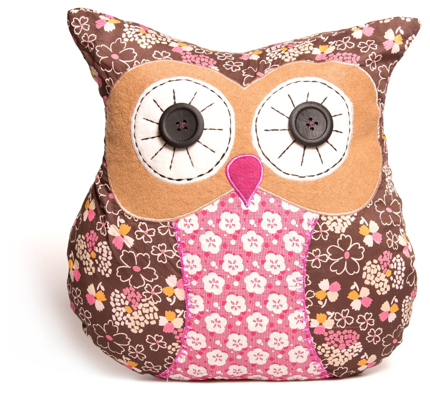 Huvuddelen av kudden är täckt av ett blommigt tyg. Blommorna, i nyanser av rosa, vit och även små inslag av gult, sprider sig över hela ytan och ger en lekfull känsla till designen. På ugglans mage finns ett kontrasterande rosa tyg med vita, blomliknande motiv, vilket ger ett ytterligare lager av intresse till dess utseende.