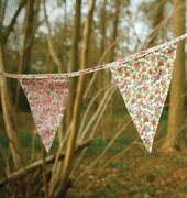 Bilden visar en produkt som finns tillgänglig på Köpstaden.se, nämligen Vimpel Blommor från Sass & Belle. På bilden kan vi se en rad vimplar som hänger mellan träden i en skogsmiljö. Vimplarna består av tygstycken formade som trianglar och visar en variation av blommönster i milda, jordnära färger såsom rosa, grönt och krämvitt. Varje tygtriangel har ett unikt mönster, vilket skapar en härlig variation och ger intrycket av en handgjord känsla.