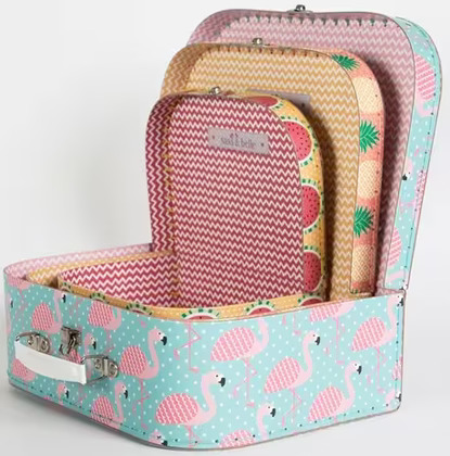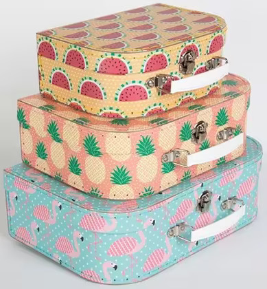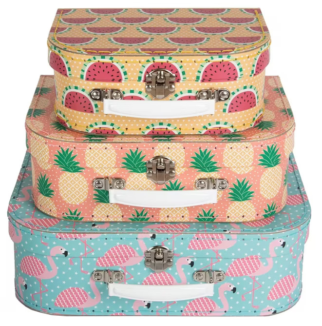 Härligt somriga förvaringsväskor i cardboard som levereras i 3-pack. Alla väskor som går i sommartema med färgglada frukter samt flamingos har matchande sömmar, metallspännen samt vitt handtag. Mått: 21 x 10 x 7 cm 23 x 17 x 8 cm 29 x 20 x 9 cm