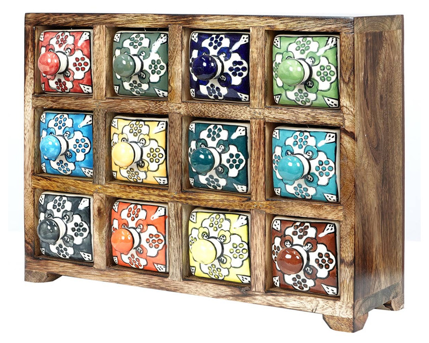 Detta vackra lilla skåp är både praktiskt och dekorativt, med sina färgglada keramiklådor som skapar en härlig bohemisk känsla. De utdragbara lådorna är perfekta för att förvara kryddor, smycken eller andra små ting – som nycklar, sybehör, te eller små minnen från resor.