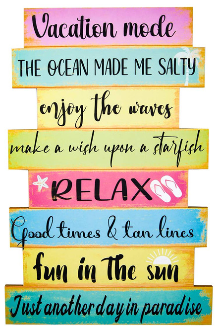 Fånga semesterkänslan året runt med denna färgglada träskylt full av strandinspirerade citat. Perfekt för att skapa en avslappnad atmosfär i hemmet, sommarstugan eller på uteplatsen. Skylten sprider glädje med sina livfulla färger och positiva budskap som påminner om solsken, havsbris och bekymmersfria dagar. En härlig detalj för dig som älskar stranden och semesterkänslan.