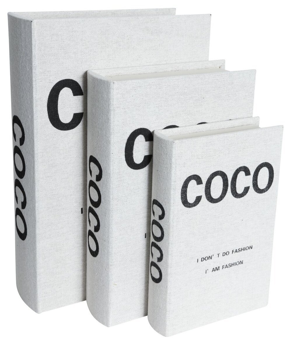 Dekorativa boklådor i set om 3 stycken med linneliknande omslag. Text - Coco I don't do fashion, I'am fashion.