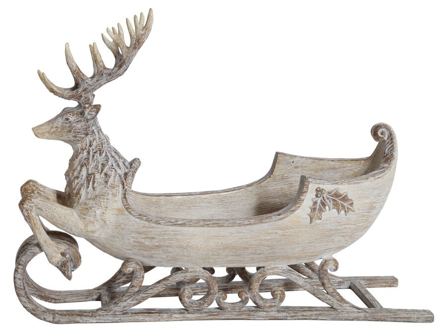 Renens framträdande horn är skulpterade med precision, vilket ger en kraftfull och imponerande inramning till släden. De intrikata detaljerna i renens päls är noggrant utformade, vilket ger en känsla av naturlig rörelse och realism.