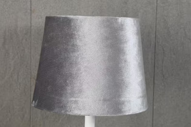 Lampskärmens form är traditionell med en något avsmalnande topp som gradvis breddas neråt, vilket är en klassisk design för många lampskärmar. Det gråa sammetstyget reflekterar ljus på ett diskret sätt, vilket skapar en lätt skiftande effekt beroende på ljusets riktning och intensitet. Den enfärgade ytan ger ett rent och neutralt intryck som kan passa in i olika inredningsstilar och färgteman.