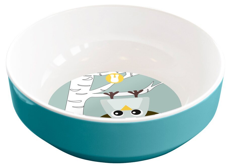 Skålens utsida pryder en klar blå nyans som ger en pigg och fräsch känsla. Insidan av skålen är huvudsakligen vit, vilket skapar en fin kontrast till det yttre färgvalet. På botten av insidan syns en charmig illustration, där en uggla med stora, vänliga ögon tittar upp. Runt ugglan syns grenar och löv i subtila nyanser, vilket ger en känsla av en skogsmiljö och skapar en naturinspirerad estetik.