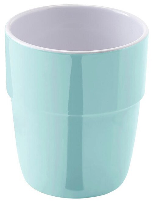 Muggens form är enkel och funktionell med en lätt avsmalnande design som gör den lätt att hålla i handen. Den har en smidig yta, vilket kan bidra till bekvämlighet vid användning. Insidan av muggen är vit, vilket skapar en tydlig kontrast mot den turkosa utsidan. Denna färgkombination kan ge en tidlös och frisk look som lätt passar in i olika kök och miljöer.