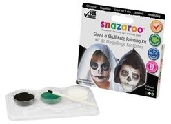 Bilden visar en produkt från Köpstaden.se, känt för sitt breda utbud av produkter för alla typer av vardagsbehov. Här presenteras en ansiktsfärgssats från varumärket Snazaroo, perfekt för att skapa skrämmande looks, såsom spöken och skelett.