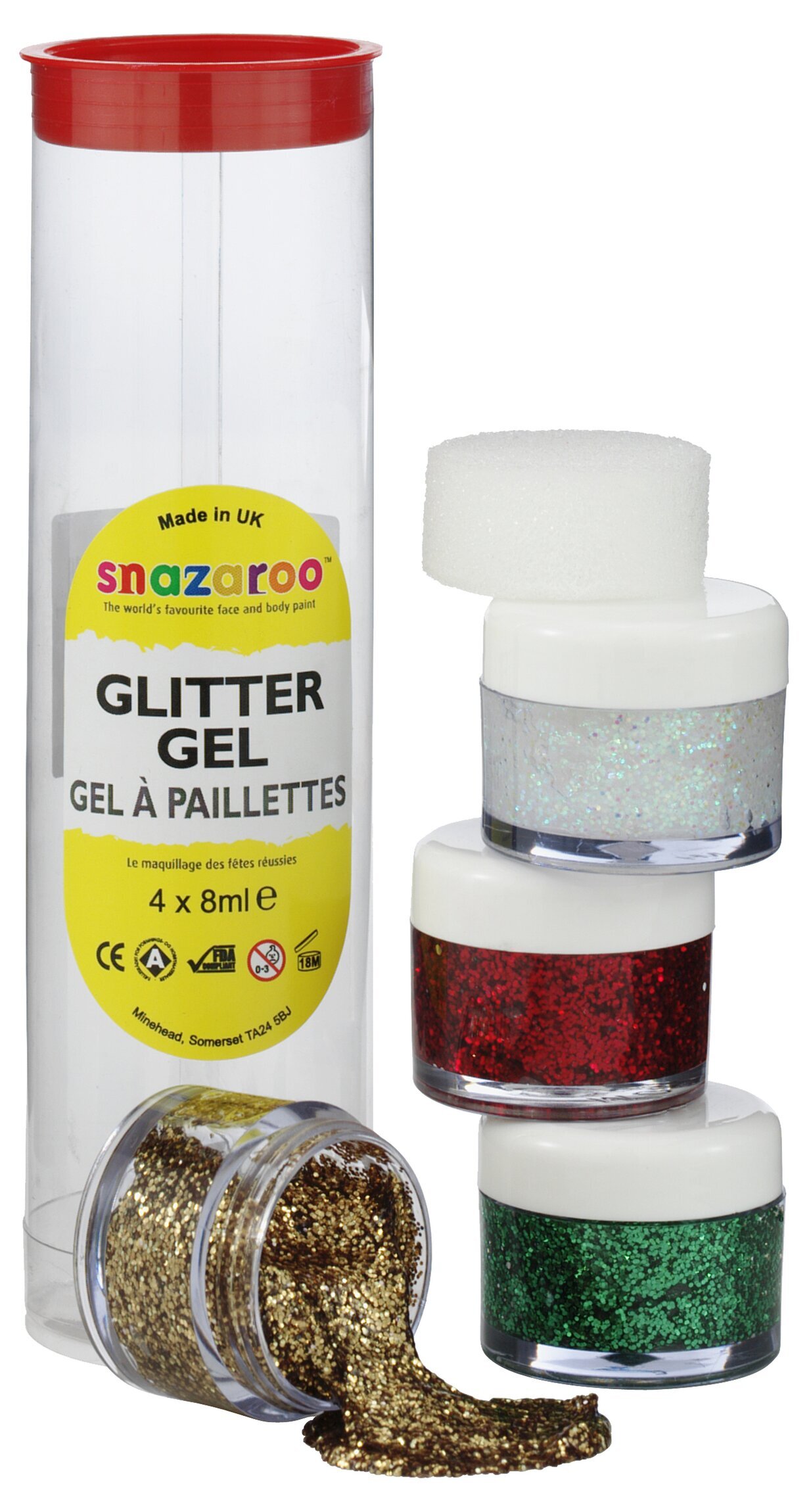 Tub innehållande 4 stycken burkar med glittergel i färgerna stardust, guld, grön & röd. Använd glittergelen direkt på huden eller över din ansiktsmålning för att skapa vackra effekter.